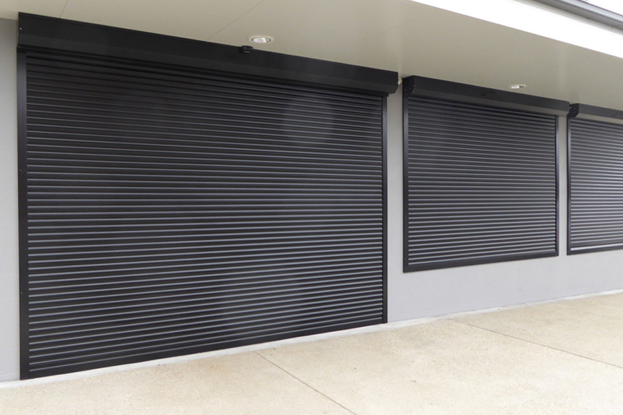 Secure grille shutters offering ventilation and visibility for retail and commercial spaces.